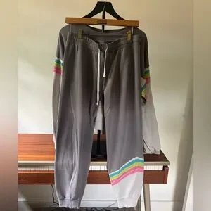 Gray sweatshirt with pink, blue, and green stripes. Paired with matching drawstring sweats. Casual and vibrant style.