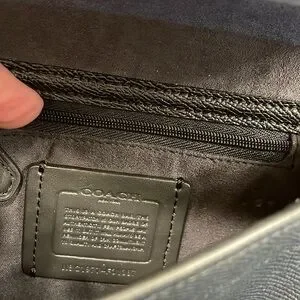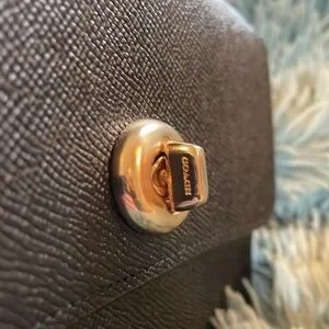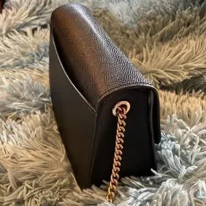Black cross grain leather Crossbody purse. Very classic with gold hardware, perfect for a holiday event. Gold chain strap features inside, zip pocket, turn lock outside closure, inside fabric lining and outside slip pocket. Strap is 22 inch drop from shoulder 7” L X 5” H X 3” W. Spotless and only used one time. Previous owner said they received it as a gift and had never used it.