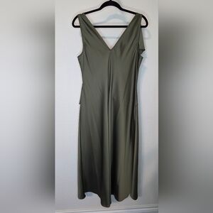 Elegant olive green ruffle midi dress by Lauren Ralph Lauren, size 14. Perfect for weddings, cocktail parties, or formal events. Flattering V-neckline, cascading ruffles along the front, and sleeveless design. The smooth satin-like fabric drapes beautifully, offering both comfort and sophistication.