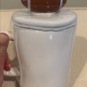 Celebrate game day with this Rae Dunn mug. White body with a brown football lid. Perfect for sports fans. Plastic holding lid on is still in place so great gift!