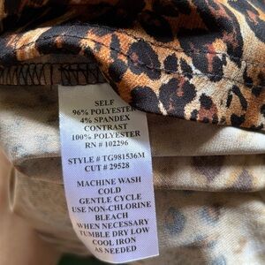 This connected apparel dress is giving the Y2K vibes. All over leopard print. Six black contrasting lines in asymmetrical design that pulls the eye to one side. Strong v-neck. Sleeveless. Women’s size 10. Made of 96% polyester/4% spandex. Dress has lots of stretch. Based on length, this is approx knee length. Beautiful brown, tan and black design.