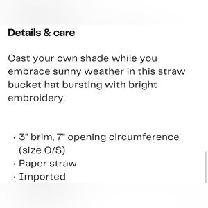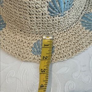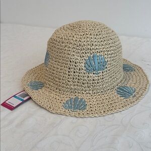 NWT This is a super cute straw bucket hat by Vince Camuto. Med tan colored straw hat with pretty blue embroidered sea shells. 3” brim and 7” opening. Perfect for the beach.