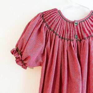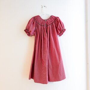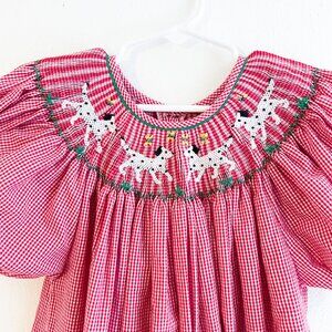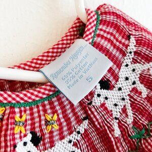 **Remember Nguyen Girls Smocked Dress Size 5 – Red Gingham with Hand-Embroidered Dalmatians / Fire Dog Theme**