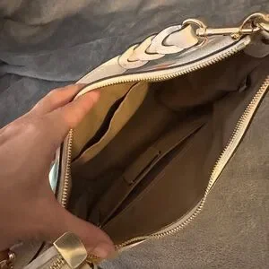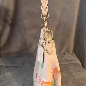 Chic Coach shoulder bag in white with colorful floral accents. Features a stylish braided strap.