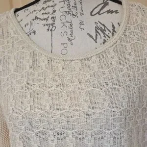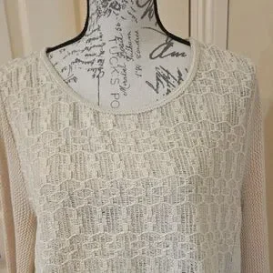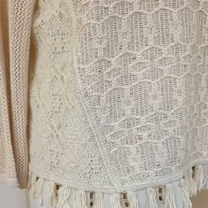 Chico's blouse featuring intricate cream chrochet & lace with beaded fringe hem adding a boho flair. Ideal for a stylish ensemble. Chico's size 2 is typically bigger than a size 2 in other brands. I fluctuate between a small or medium and this fits me a bit loose as it is styled to be a bit loose. The different textures in this shirt are quite unique and really pretty.