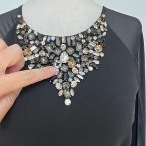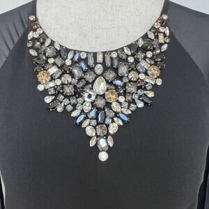 Scoop neckline with embellishments; Column silhouette