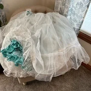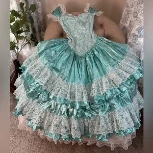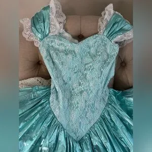 The BIGGEST, most 80s prom dress ever!!!! This is vintage 80s gorgeousness! Other than the back bow needing to be tacked back into place (see pictures), there are no noted flaws! Recently cleaned and ready for a new adventure. Hard to find “larger” size 8. See measurements in pictures to ensure desired fit. Measurements may be slightly off due to the sheer volume of the dress. To show off the fullness of the skirt, wear with a hoop!
