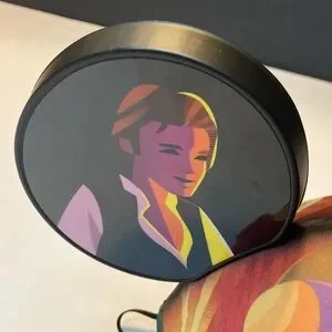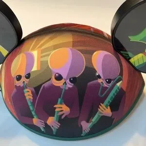 The front of the hat includes Greedo on one ear pointing a blaster at Han Solo on the other ear. The front body of the hat includes several Bith musicians of the Cantina band Figrin D’an and the Modal Nodes.