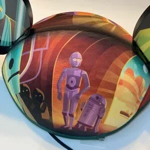 The rear of the hat includes Obi-Wan Kenobi with a light saber on one ear and Luke Skywalker and Chewbacca on the other ear. The rear body of the hat shows R2-D2 with C-3PO and 2 Jawas.