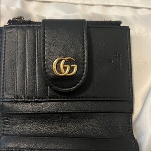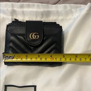 Gucci wallet in black quilted leather. Features gold GG logo. Compact and stylish. See pictures for details & dimensions. Used in very good condition.