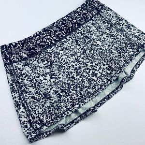 Lululemon Pace Rival Skirt for tennis/pickleball/running, or bikini bottom coverup. Women's size 10. *NOTE: Defect: No built-in liner shorts--they've been removed. You'd need to wear a swimsuit or your own bike shorts or liner shorts with this miniskirt.* Inner back zipper pocket. Internal front continuous drawcord / drawstring. Slightly higher in front than back. Slight pleating in back. Fun, durable stitching. Waistband is white spots on black background; from the waistband down is black spots on white background. So cute! Neutral but fun pattern.