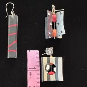 2 pairs of unique geometric earrings. The rectangular ones feel like resin. Excellent used condition except for the square shaped multidimensional pair needs new earring backs.