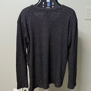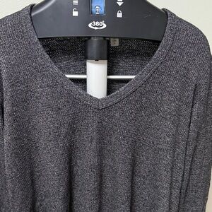 Chic and comfortable long sleeve top. Features a stylish V-neck design. Bottom slit on one side. Ideal for layering or wearing alone. 100% cotton.