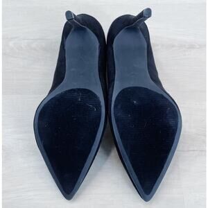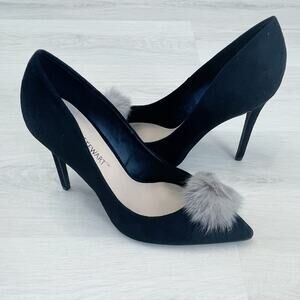 Super cute black faux suede pom pom stiletto heels from Ashley Stewart. Daring 4.5” stiletto heel. Black faux suede material. Cushioned insole. Soles show some debris from store try-on. Never worn outside, only tried on. New in box, no flaws to note.