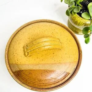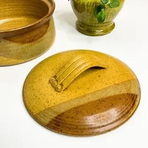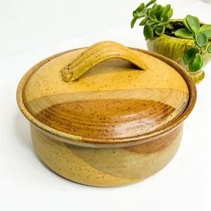 Bring warmth and artisan charm to your kitchen with this beautiful handmade stoneware covered dish! Featuring a gorgeous earthy glaze in warm honey tones with natural variations, this piece showcases true craftsman quality. The perfectly fitted lid with its elegant curved handle makes this ideal for baking and serving a small casserole or displaying as a stunning decorative piece. Whether you're a collector of handmade pottery or simply appreciate functional art in your home, this timeless stoneware dish combines rustic beauty with everyday versatility.