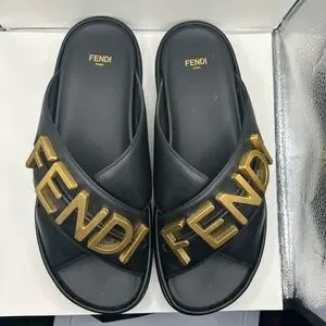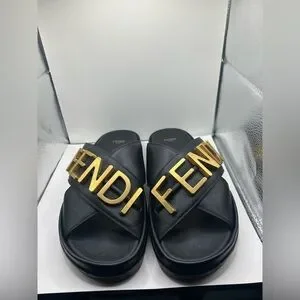Fendi Black Slides with Gold Logo