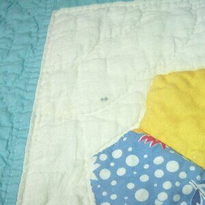 Vintage American handmade patchwork granny quilt, or bed topper in the Dresden plate pattern. The pattern has TWENTY squares. The reverse side is plain ivory with the blue trim. Nice quality. Measures 68" by 88". It is laying on a queen bed in the photos. The first photo shows it in the bag that I just got back from the cleaners, so it's fresh for you! Very good condition except for the few tiny spots that I found, seen in the photos. These look like a faded ink stain (pretty light, and small) Very colorful and a nice keepsake!