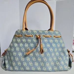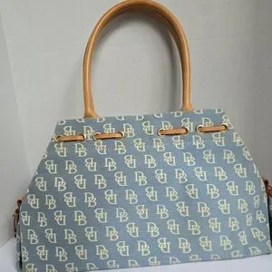 Light blue canvas with cream colored signature Dooney & Bourke monogram on canvas. Light brown leather trim and handles.