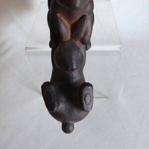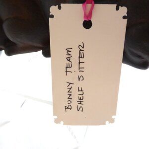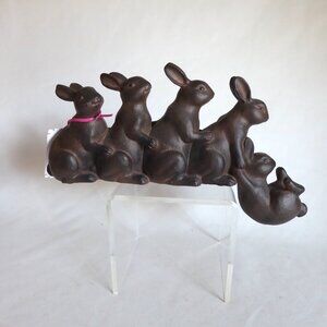 New, never used for its purpose, shelf sitting resin figure / statue of a team of bunny rabbits lifting one from falling off. It is fabricated to look like bronze metal. It requires you to place on the edge of a surface to allow the one bunny to hang off the edge. This was purchased at a boutique and still carries its original price tag.