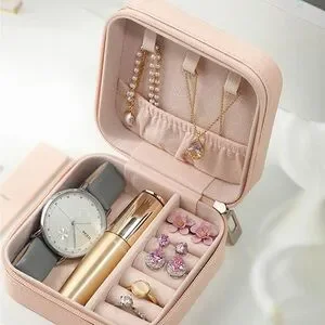 Chic pink jewelry box with multiple compartments. Perfect for organizing necklaces, rings, and earrings.