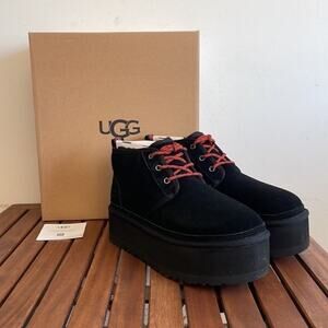 UGG Neumel Heritage Platform Suede Sherpa Tie Mini Ankle Bootie Boots Black Red