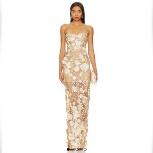 Elegant strapless dress with floral embroidery. Features a sheer overlay. Perfect for special occasions.