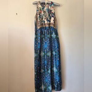Stunning floral jumpsuit featuring a vibrant blue pattern. Contrasting top and bottom print. Sleeveless full length. V-Neck wrap front. Hidden in-sema side zip closure. Polyester. Perfect for any occasion PTP 18". Waist 14". Has loops to add belt but belt is not provided.