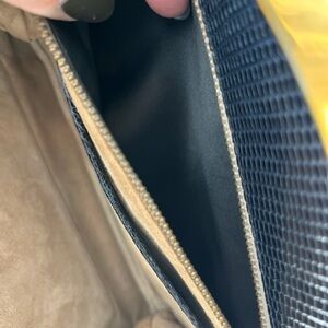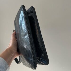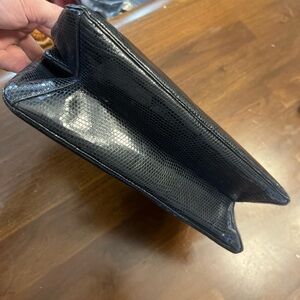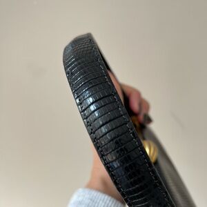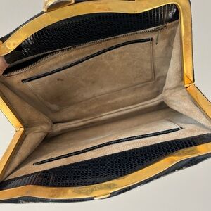 Gorgeous black vintage eelskin leather kisslock handbag with gold tone hardware. Leather is buttery soft in excellent condition. Suede, leather, and satin interior. Some light stains to the interior suede. Interior zipper pocket is satin lined. No corner rubbing. No strap wear. Hardware has tarnish. Surface scratch to one side of bag as seen in photos
