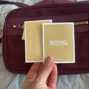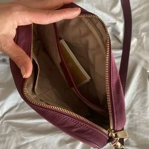 Elegant wine crossbody bag. Features gold zipper and logo. Adjustable strap for comfort. Perfect condition never used!