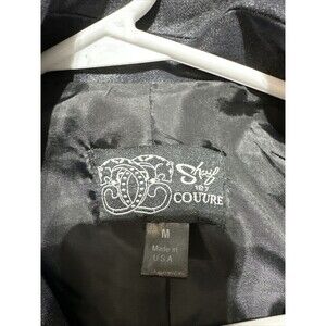 Keywords: Sharif 187 Couture, trench coat, metallic gray, embellished, double breasted, belted, medium, outerwear, fashion, designer coat, women's clothing, statement piece, shoulder embellishments, couture