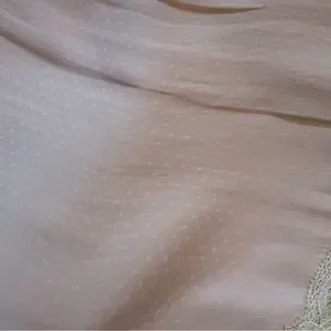 Feminine slip/skirt in a blush pink with a light polka dot design. Faux wrap around with multiple ties. Features delicate lace trim. Perfect for versatile styling.