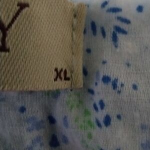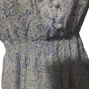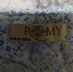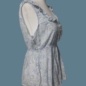 NWOT Romy Blue and White Floral Ruffle Blouse Gathered At Waste, button front, Size XL