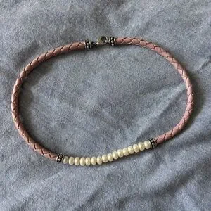 Elegant Brighton necklace with pink braided leather and silver accents. Features a row of cream beads.