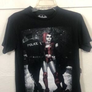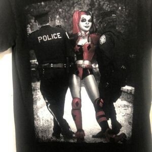 Keywords: Batman t-shirt, Harley Quinn shirt, Graphic tee, DC Comics, Police graphic, Black tee, Men's t-shirt, Comic book shirt, Gotham City, Casual wear, Fan apparel, Crew neck, Short sleeve