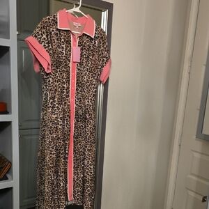 Stylish leopard print maxi dress. Features pink collar and trim. Short sleeves. Button-down front.