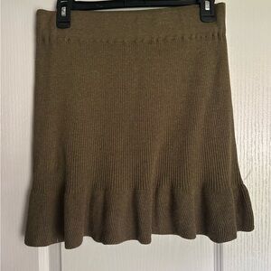 Effortlessly cool and cozy, this Stitches & Stripes mini skirt in a muted olive green tone adds subtle texture and charm to your wardrobe. Crafted in a soft cotton-acrylic blend, the ribbed knit hugs gently while offering stretch and movement. The flared ruffle hem adds a flirty touch, perfect for quiet luxury, downtown girl, or soft academia aesthetics.