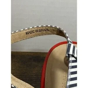 The Kate Spade Tropez Wedge Heel Sandals in size 10M are stylish women's shoes perfect for adding a touch of sophistication to any outfit. Featuring a sleek striped pattern, strappy design, and comfortable leather upper, these sandals are both fashionable and practical. The wedge heel adds a touch of elegance while the buckle closure ensures a secure fit. With the iconic Kate Spade brand name, you can trust that these sandals are a high-quality choice for your summer footwear collection.