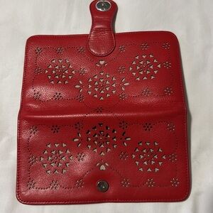 This is a preowned Vtg rare large leather Brighten Paris red clutch wallet. (In EUC) It features intricate cut-out designs. It has 9 CC or ID slots, 4 long bill slots. 2 are zippered. It measures 9” X 5”.