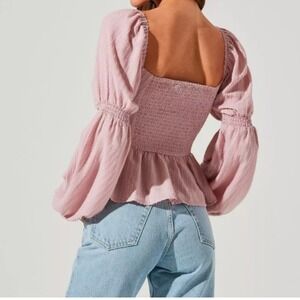 Keywords: peplum top, square neck blouse, long sleeve top, balloon sleeve blouse, smocked bodice, pink blouse, romantic top, casual blouse, ladies top, womens fashion top, dressy casual, boho blouse, elegant blouse