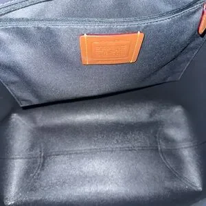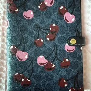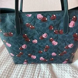 Coach blue tote set with cherry print. Includes tote, planner , and wristlet . Stylish blue and pink design.