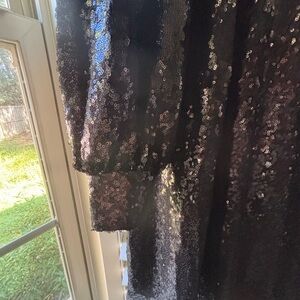 Worn once. Excellent condition. Chic black sequin dress with intricate white lace collar. Ideal for elegant events.