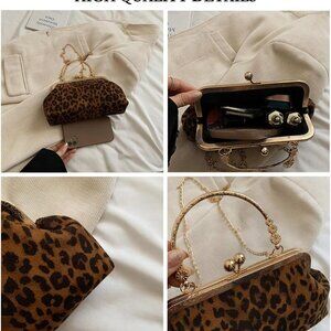 Small Leopard Suede Evening Clutch Purse with Chain Cheetah Print Kiss Lock Even