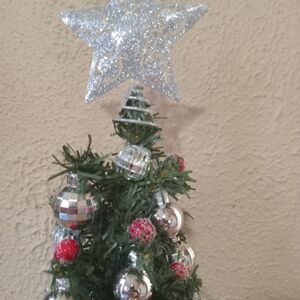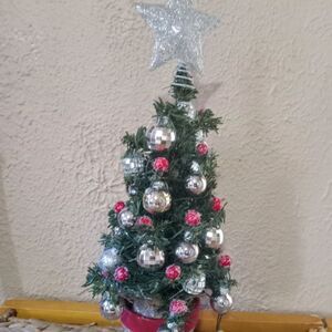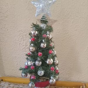 16" Predecorated Prelit Artificial Xmas Tree. Silver glass/mirror ornaments.