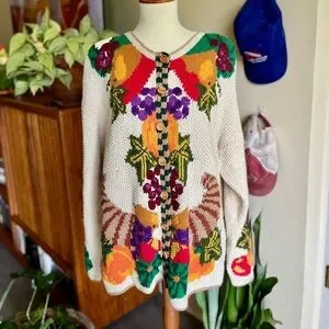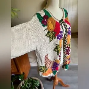 The holy grail of vintage fall cardigans. This hand-knit gem features a harvest scene with all the classic autumn details— pumpkins, a cornucopia, leaves, apples, and more! Beautifully detailed and in great vintage condition. Wooden buttons add a cozy flair! 🍂