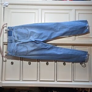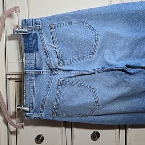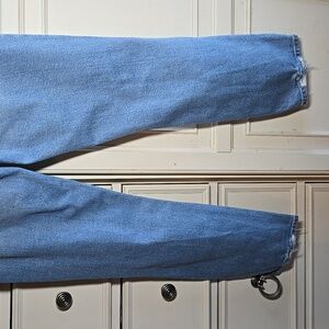 Stylish blue jeans with distressed details. High-waisted fit. Perfect for casual wear.