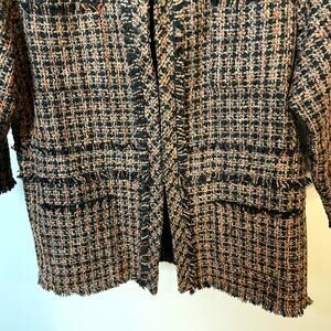 Gently used, beautiful orange and black tweed jacket from Misook in a women's size extra large. It's a wool blend, not itchy, excellent condition, no flaws!