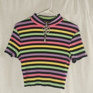 hard to find NWOT Killstar Rainbow Pastel Striped short sleeve Rib Knit Pentagram Crop Top sz XL. super stretchy. excellent new condition. paper tag came off but tag leash is still attached to the size tag. large pentagram zipper pull.