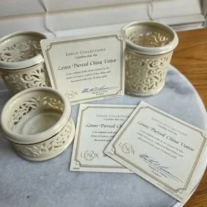 Intricate delicate fretwork like design tea light votives trimmed with 24K gold. Set of 3, two taller and one short. No chips, or cracks that I can find. Comes with certificates. Perfect for elegant events or a touch of luxury in your home.