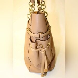 Coach New York Colette Leather Stripe North South Shoulder Tote Bag. Excellent preloved condition made with genuine Pebbled leather and gold hardware. has has surface refinished due to color rub off from wearing denim. but looks like new.