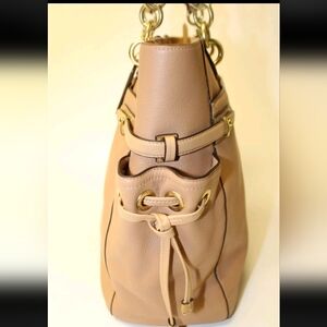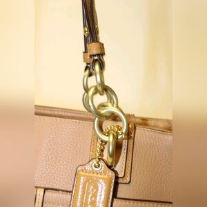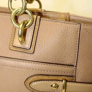 Stylish and versatile tan tote bag with gold accents. Perfect for any occasion.